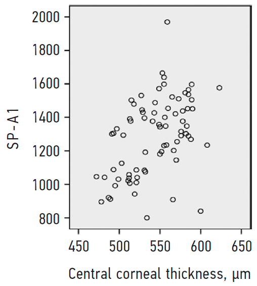 SP-A1 indicating stiffness of the entire fibrous tunic also did not differ. However, there were significant differences between patients with PEG and the control group (p = 0.046), whereas the difference was not significant in patients with POAG (p = 0.055). SP-A1 is known to be dependent on IOP and CCT in healthy eyes. The analysis of correlations in eyes with POAG found that SP-A1 directly depended on Р0 IOP (p = 0.001) and CCT (p = 0.001; Fig. 1), whereas in eyes with PEG, p values were 0.001 and 0.001, respectively (Fig. 2). As patients with PEG in our sample have thinner cornea, we can assume that patients with PEG and similar SP-A1 have stiffer fibrous tunic.