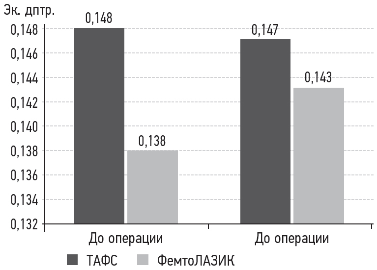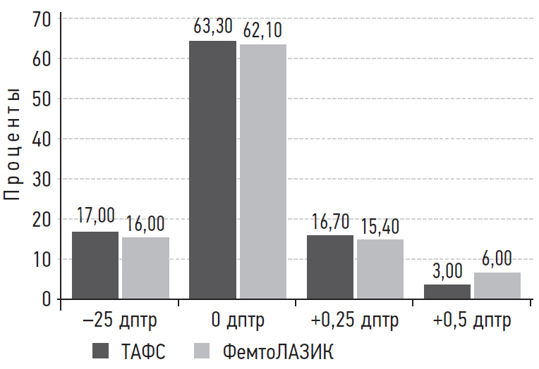 При анализе рефракционного результата через 1 мес., а именно сфероэквивалента (SE), в обеих группах получено 100 % попадание в диапазон от –0,5 до +0.5 дптр (рис. 2). Послеоперационный общий цилиндрический компонент рефракции не выходил за пределы ±1,0 дптр и был аналогичный в обеих группах. В абсолютном большинстве случаев (78,26 % после ТАФС и 81,63 % после ФемтоЛАЗИК) цилиндрический компонент рефракции находился в пределах ±0,5 дптр. При этом стоит отметить, что для расчётов параметров при выполнении операции ФемтоЛАЗИК использовали индивидуальную номограмму с многофакторным пересчётом параметров в каждом случае, а при операции ТАФС номограмма не требовалась и параметры закладывались в лазер «один в один» с данными субъективной рефракции.
