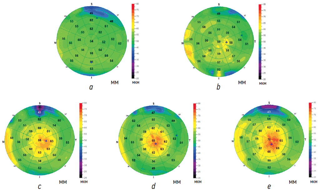 Рис. 3. Эпителиальная карта пациента с миопией высокой степени и регрессом рефракционного эффекта: а — до операции; b — через 1 мес. после операции; c — через 3 мес.; d — через 6 мес.; e — через 1 год