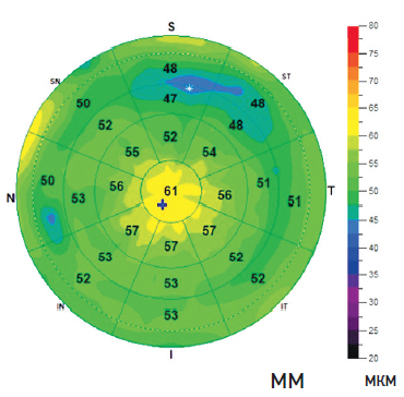 Назначение дополнительной дегидратирующей гипероcмолярной и противовоспалительной терапии, после выявления гиперпластического эффекта, позволило уменьшить толщину эпителия, вероятно, за счёт уменьшения жидкостного клеточного содержимого на 8–12 мкм и достичь повышения НКОЗ в среднем на 2 строки (рис. 4).