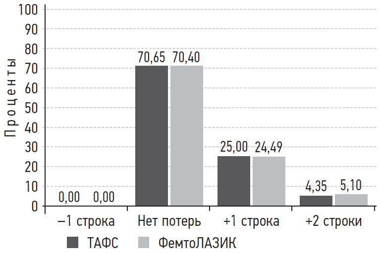 Важный критерий оценки кераторефракционной операции — изменение строк МКОЗ относительно дооперационных значений. Данное значение определяет параметр безопасности КРХ, при обеих технологиях она была высокой, характеризовалась прибавкой до двух строк в 4,35 % случаев по технологии ТАФС и в 5,10 % случаев — по технологии ФемтоЛАЗИК. Ни в одном случае не наблюдалось потерь строк МКОЗ (рис. 5). Прибавка строк отмечалась преимущественно у пациентов с миопией высокой степени, что, вероятно, было обусловлено увеличением ретинального изображения по сравнению с дооперационным моделированием с помощью пробных диагностических стекол.
