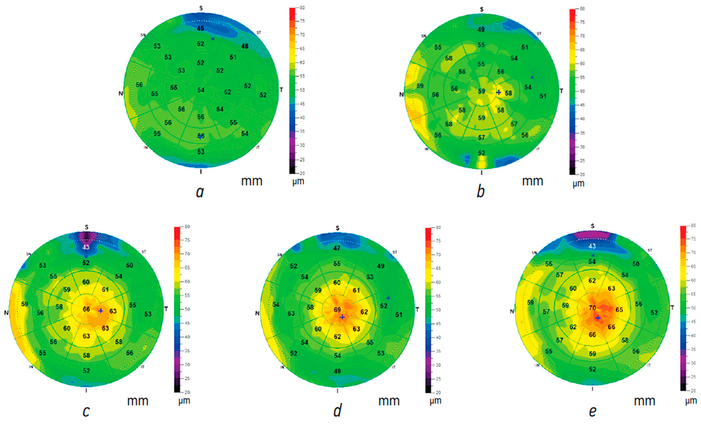Fig. 3. Epithelial chart of a patient with high myopia and regression of the refractive effect: a — before surgery; b — 1 month after surgery; c — after 3 months; d — after 6 months; e — after 1 year