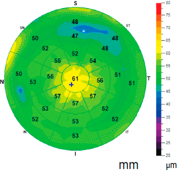 When hyperplasia was detected, additional dehydrating hyperosmolar and anti-inflammatory therapy reduced the epithelium thickness by 8–12 μm, probably by decreasing cellular liquid content, and increased UСVA by an average of 2 lines (Fig. 4).