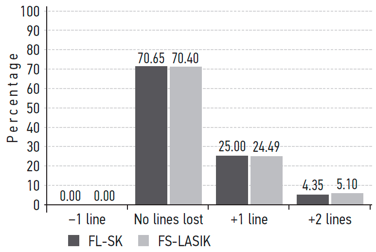An analysis of the refractive outcomes (spherical equivalent [SE]) at month 1 found that 100% of eyes in both groups were within –0.5 to +0.5 D of the target refraction (Fig. 2). Postoperative total refractive cylinder was within ±1.0 D and similar in both groups. In the vast majority of cases (78.26% after FL-SK and 81.63% after FS-LASIK), cylinder was within ±0.5 D. Notably, an individual nomogram was used with multivariate calculation of the parameters in each case for FS-LASIK, whereas no nomogram was required for FL-SK, as the parameters were set in compliance with the subjective refraction data.