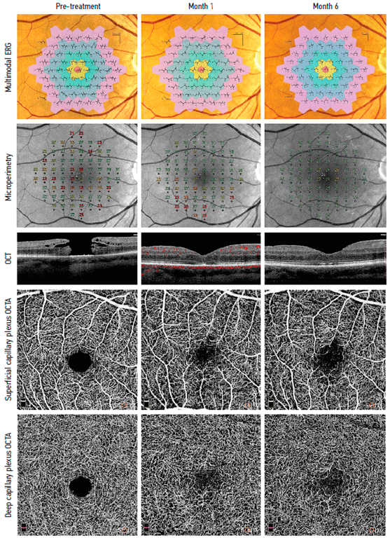 Рис. 1. Пример мультимодальной визуализации у пациента со сквозным макулярным разрывом в течение периода наблюдения: паттерны мультифокальной электроретинографии (ЭРГ) и микропериметрии, линейные сканы и анфас-изображения изучаемых структурных изменений фовеа при проведении ОКТ и ОКТА