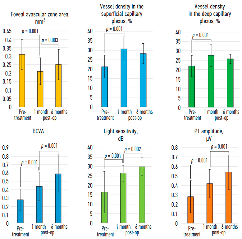 MATERIALS AND METHODS: A prospective study included data of 93 patients (93 eyes) with full-thickness macular holes. Optical coherence tomography-angiography (OCT-A), visual acuity testing, microperimetry, and multifocal electroretinography were performed before surgical treatment, after 1 and 6 months. We studied the relationship between changes in foveal avascular zone area, vessel density in the superficial capillary plexus (SCP) and deep capillary plexus (DCP) with changes in best corrected visual acuity (BCVA), retinal sensitivity (RS) at the fixation point and P1 amplitude in the fovea at different periods after treatment.
