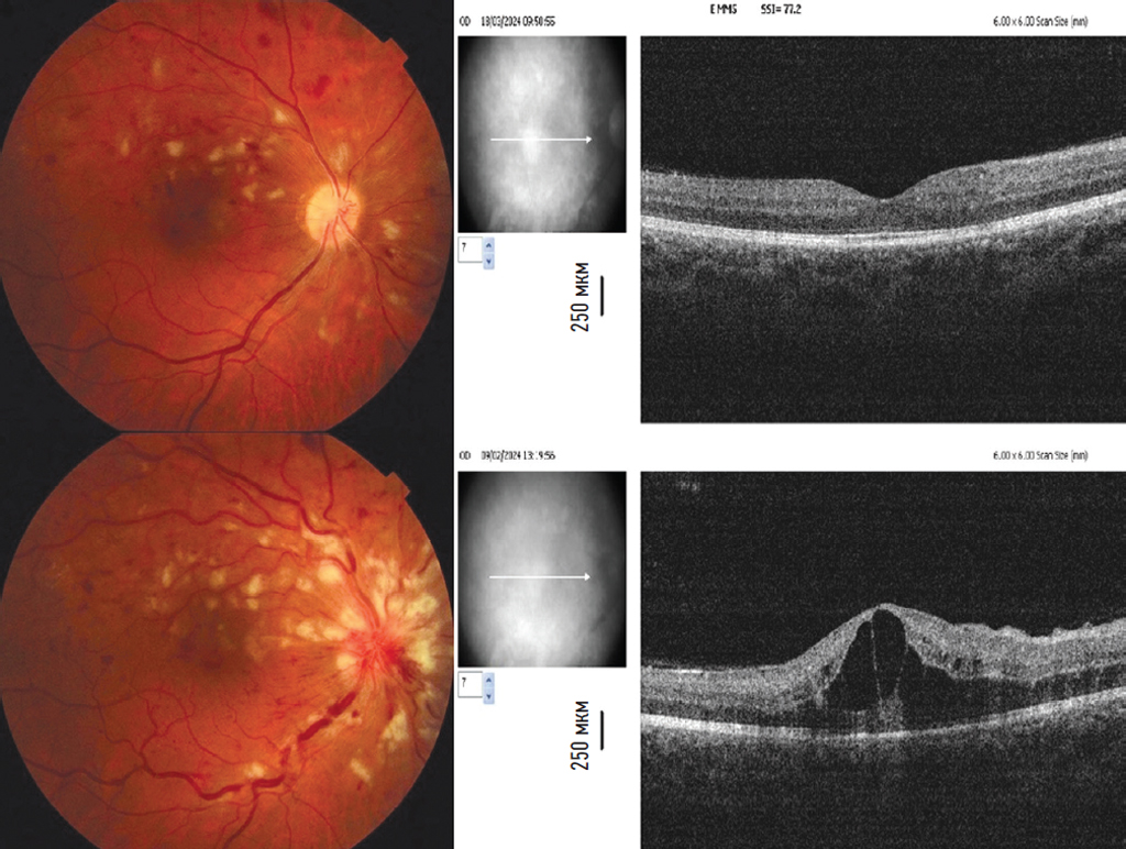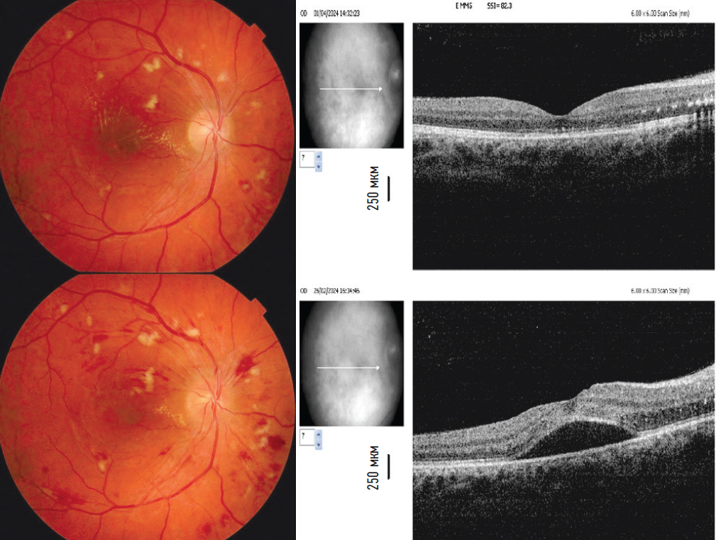 Рис. 3. Офтальмоскопическая картина и оптическая когерентная томография состояния глазного дна правого глаза через месяц после лечения (сверху) и до лечения (снизу).