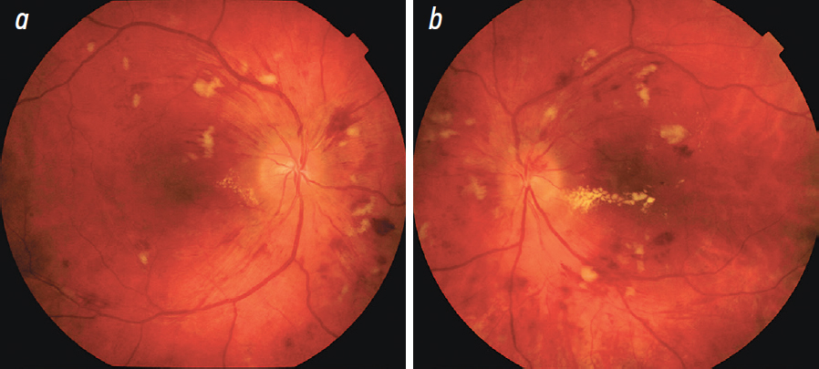 3. Рис. 2. Офтальмоскопическая картина глазного дна пациента: а — правый глаз; b — левый глаз.