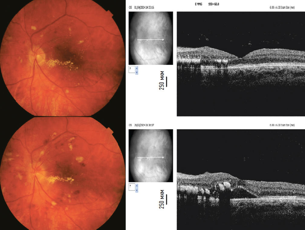 Рис. 4. Офтальмоскопическая картина и оптическая когерентная томография состояния глазного дна левого глаза через месяц после лечения (сверху) и до лечения (снизу).