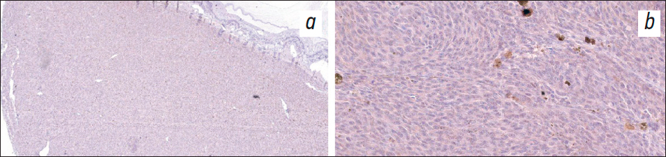 Fig. 1. Immunohistochemistry of BAP1: a, negative BAP1 expression, ×50; b, false positive reaction in pigment, ×400.
