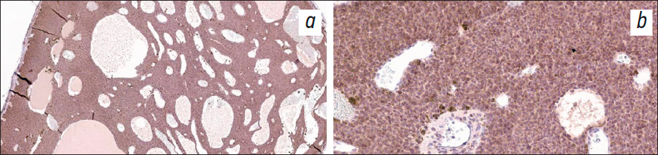 Fig. 2. Immunohistochemistry BAP1: a, homogeneous diffuse cytoplasmic expression of BAP1, ×50; b, granular expression of BAP1 over the entire tumor area, ×400.