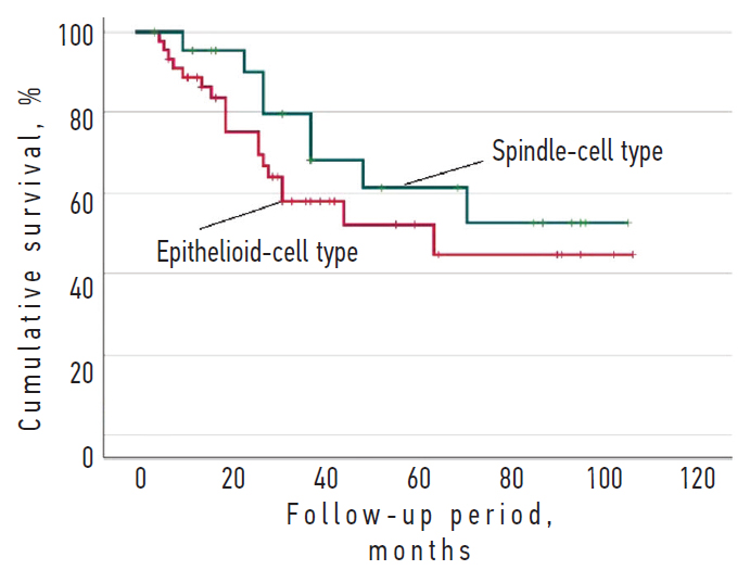 Kaplan–Meier survival analysis was performed in two histological groups (epithelioid-cell/mixed-cell vs. spindle-cell tumors). Due to insufficient number of patients, groups with mixed-cell and epithelioid-cell tumors were pooled. Mean survival was 62.2 months in these patients and 72.9 months in patients with a spindle-cell tumor. Overall mean survival was 65.8 months.