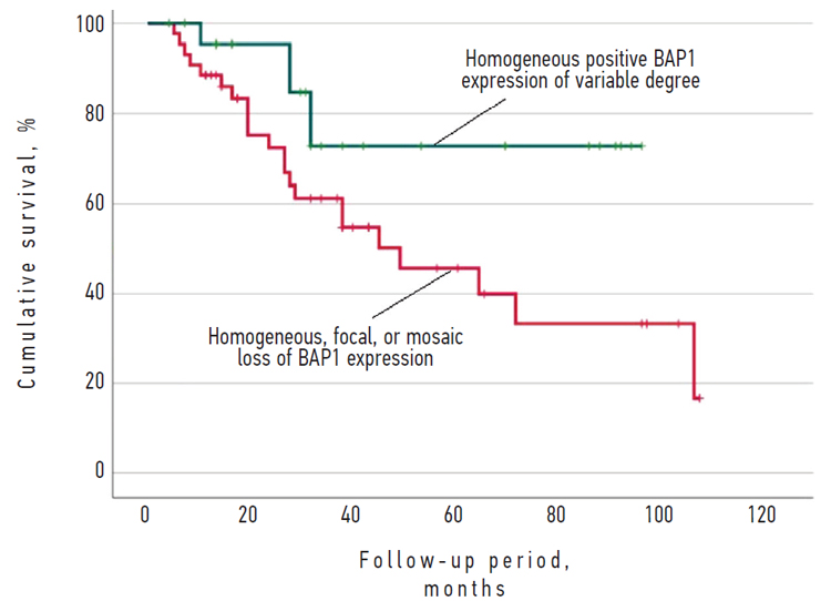RESULTS: Median survival in patients with homo- or heterogeneous (focal, mosaic) loss of BAP1 expression was 48 months, whereas patients with homogeneous BAP1 expression of variable degree (mild to severe) did not achieve the median by the end of follow-up. The log-rank test showed statistically significant differences between these groups (χ2=4.344; p=0.037). Mortality risk for patients with homo- or heterogeneous loss of BAP1 expression was 2.6 times higher (HR=2.602, 95% confidence interval: 0.573–0.96). However, mortality risk for patients with epithelioid cell and mixed tumor types was only 1.27 times higher than for patients with spindle cell cancer (HR=1.265, 95% confidence interval: 1.062–2.846).