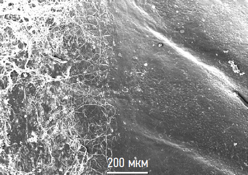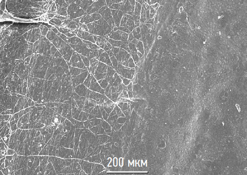 Рис. 2. Сканирующая электронная микроскопия. Корнеосклеральный отдел трабекулярной сети. Основная группа. Увел. ×500.