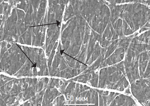 Рис. 5. Сканирующая электронная микроскопия. Увеальная часть трабекулярной сети. Контрольная группа. Стрелками указаны гранулы пигмента. Увел. ×500.