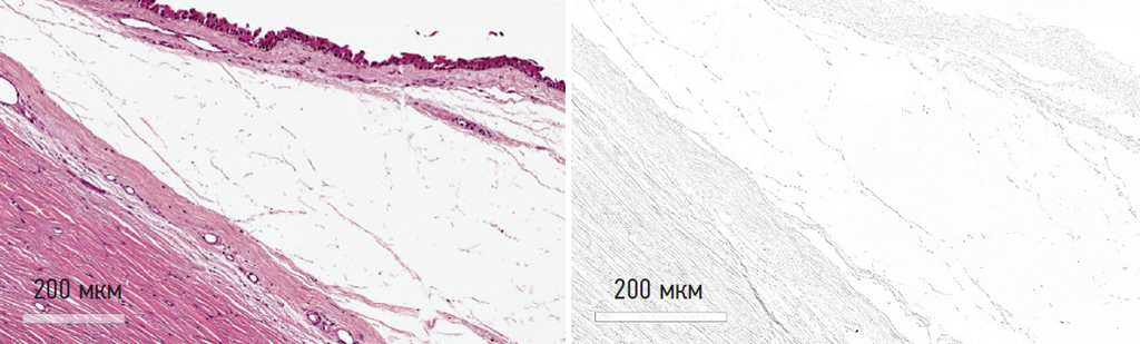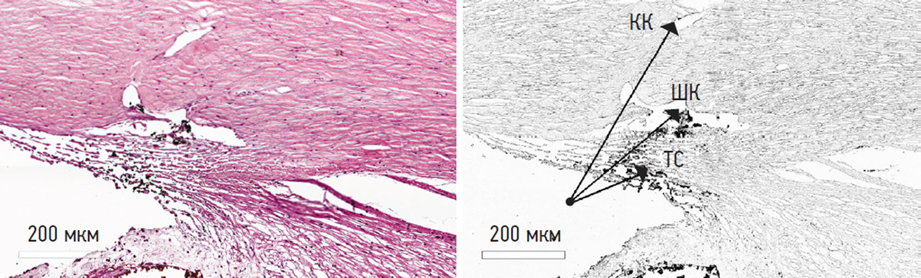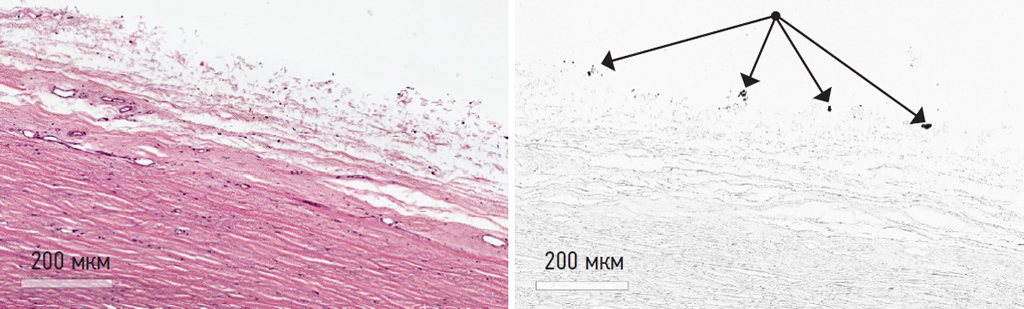 После экспериментального моделирования трабекулопилинга и герметизации глазного яблока осуществляли инъекцию водного раствора дисперсной чёрной туши в переднюю камеру через парацентез до гипертонуса, после чего глазное яблоко помещали в фиксирующий раствор (10% раствор нейтрального формалина). Для гистологического анализа вырезали секторальные образцы из передней части глазного яблока в области моделирования трабекулопилинга, а также из противоположной (интактной) стороны в качестве контрольного образца. После вырезки образцы подвергали процессу обезвоживания и обезжиривания в спиртах восходящей концентрации, затем заливали в парафин и изготавливали серийные срезы. Часть монтированных срезов на предметных стёклах окрашивали гематоксилином и эозином, а другую часть подвергали депарафинизации с последующим просветлением без окраски. Исследование выполняли под микроскопом фирмы Leica DM LВ2 при 50-, 100-, 200-, 400-кратном увеличении с последующей фоторегистрацией на слайд-сканере Leica Aperio CS2.