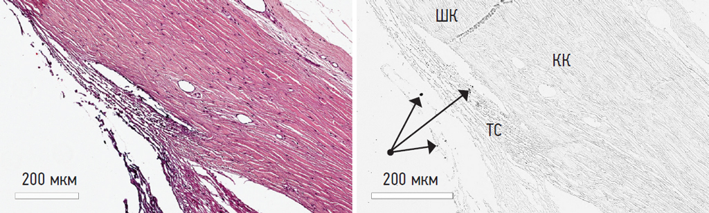 Рис. 9. Гистологический препарат дренажных путей глазного яблока. Контрольная группа. КК — коллекторные канальцы; ШК — шлеммов канал; ТС — трабекулярная сеть. Стрелками указаны чёрные гранулы красителя. Окраска гематоксилином и эозином. Увел. ×200.