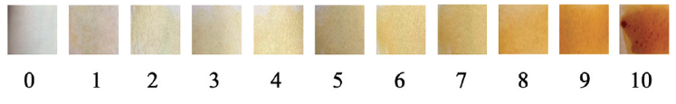 Рис. 1. Шкала степени окрашивания кожи. 0 — нет окрашивания (не вызывает дискомфорт); 1 — низкая интенсивность окрашивания; 2–6 — средняя интенсивность окрашивания; 7–9 — высокая интенсивность окрашивания; 10 — очень высокая интенсивность окрашивания.
