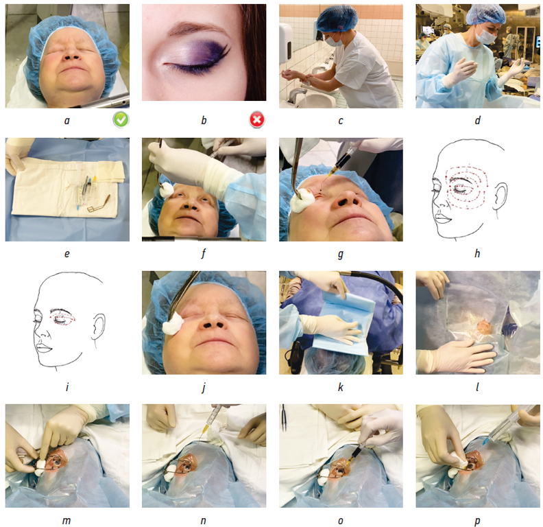По мнению M.G. Speaker и соавт. [13], гигиена придаточного аппарата глаз и конъюнктивы для снижения нагрузки комменсальной флоры является важным этапом предоперационной подготовки. О соблюдении обязательных правил в ходе предоперационных процедур сообщают Т.Р. Гильманшин и соавт. [28], обращая внимание на обработку операционного поля (в том числе веки, ресницы, брови) йодсодержащим раствором, использование векорасширителей, исключение соприкосновений иглы с веками и ресницами, век с местом инъекции, парацентезами, портами, после последнего нанесения водного раствора ПоЙ, отсутствие инфекций конъюнктивы, век или других структур придаточного аппарата глаза, исключение процедуры массажа или манипуляций в области век. Данные рекомендации могут повысить безопасность оперативных вмешательств. Кроме того, необходимо использовать адекватную анестезию для удобства и комфорта пациента, стерильные хирургические перчатки и салфетку для операционного поля [29–30].