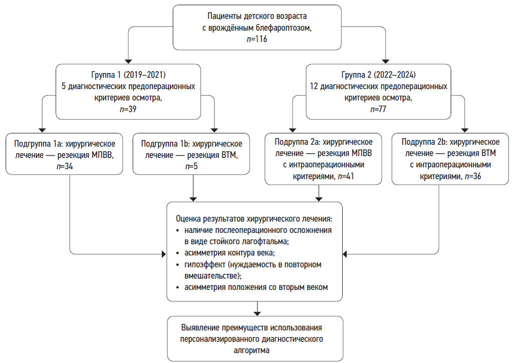 Методы. Исследование было проведено с 2019 по 2024 г., и включало 116 пациентов детского возраста с диагнозом врождённый блефароптоз, которым ранее не выполняли оперативное вмешательство. Пациенты были разделены на две клинические группы, в каждой из которых был применён различный диагностический комплекс предоперационных критериев для выбора тактики хирургического лечения. Методами оперативного лечения были: резекция мышцы, поднимающей верхнее веко, и резекция верхней тарзальной мышцы. Во второй клинической группе дополнительно применялись интраоперационные критерии диагностики. В послеоперационном периоде пациенты находились под наблюдением на 1, 3, 7-е сутки, и спустя 1, 3, 6 мес. для оценки результатов хирургического лечения.