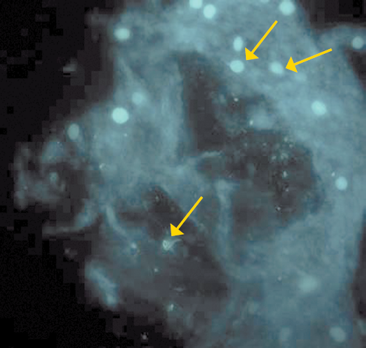 Fig. 1. Fluorescent microscopy of corneal scrapings. Calcofluor white fluorescent technique. Cysts and trophozoite form of Acanthamoeba (indicated by arrows)