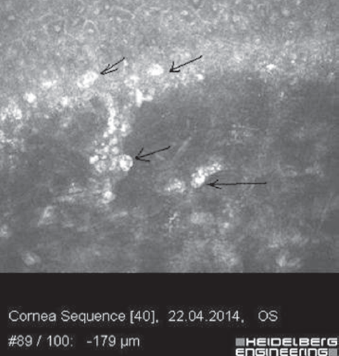 According to the corneal confocal microscopy results, acanthamoeba cysts in corneal epithelial layers up to the middle stroma in the form of bright rounded highly reflexive two-layer structures were found in all patients (Figures 2, 3). The method enabled AK differentiation from fungal keratitis and indicated the mixed nature of the infection (Figures 4, 5). In addition, the method revealed an important diagnostic point, namely keratoneuritis in the form of thickened nerve trunks and white lines along the nerves, due to the neurotropism of amoebas.