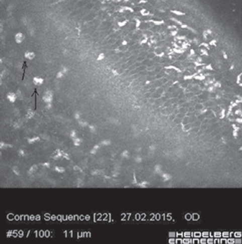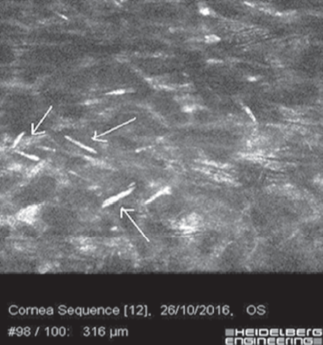 5. Fig. 4. Patient F. In the middle stroma layers in the infiltrate region are hyperreflective spindle-shaped particles visualized – Candida pseudofilaments (indicated by arrows)
