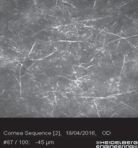 Fig. 5. Patient A. Numerous high-contrast fungi hyphae (Fuzarium) are visualized in the projection of the basal epithelium and subepithelial layers of the stromain the subepithelial layers of the stroma