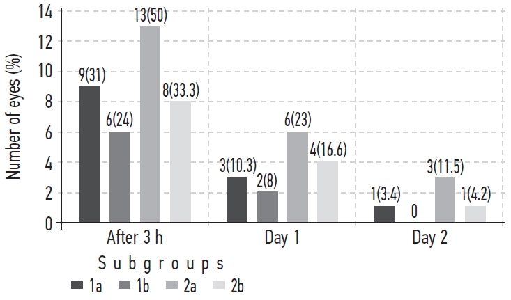 Data analysis presented in the table revealed that with comparable preoperative IOP values, it increased 3 h after surgery in subgroups 2a and 2b, with the largest (1.3 times) increase in subgroup 2a. This result is attributed to the increase in IOP higher than 26 mm Hg in six eyes of subgroup 2a and two eyes of subgroup 2b. On Day 1 after surgery, subgroups 2a and 2b experienced a decrease in IOP; however, the values were not similar. During the follow-up period, IOP values in subgroups 1a and 1b almost did not change.