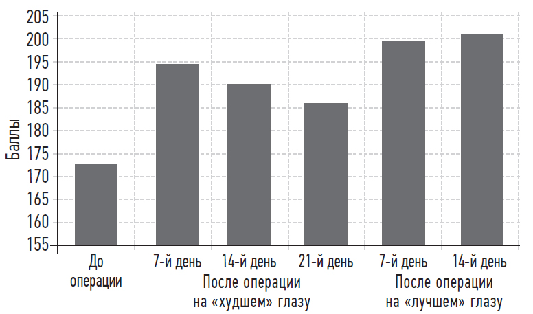 RESULTS: The high efficiency of phacoemulsification surgery was established, which is confirmed (14 days after the second procedure) by an increase in best corrected distance visual acuity to an average value of 0.92–0.95 relative units. Along with this, a certain quality of life dynamics of was revealed, which is manifested by a statistically significant deterioration (by 2.3–4.7%, p = 0.02–0.008) in the index in 14 and 21 days after the first surgical procedure compared to the data obtained at 7 days after first operation.