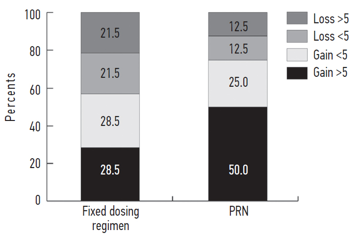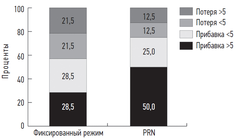 BCVA distribution at the end of the follow-up period in groups (increase or preservation / decrease in ETDRS signs) in the fixed dosing regimen group was: 8 (57%) / 6 (43%) eyes; in the group of PRN regimen: 12 (75%) / 4 (25%) eyes (p = 0.52) (see the picture).