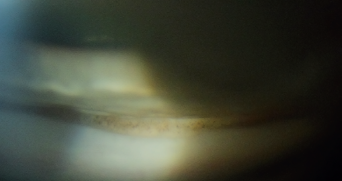Рис. 1. Гониоскопическая картина до лазерной операции: угол передней камеры открыт, средней ширины, пигментация структур трабекулярной сети выраженная, отложение псевдоэксфолиативного материала на всех структурах угла передней камеры. На 12 часах визуализируется трабекуло-десцеметовая мембрана в виде полупрозрачного прямоугольника с наложениями в виде россыпи гранул пигмента и псевдоэксфолиативного материала