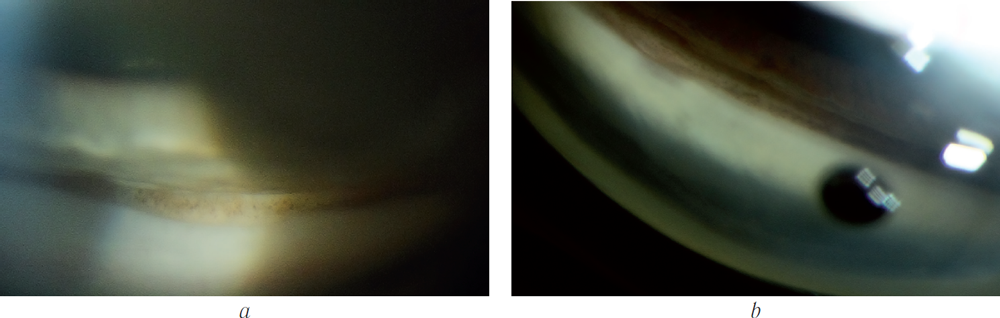 Рис. 2. Гониоскопическая картина через 2 года после лазерной операции: а — в основной группе определяются чёткие границы зоны модифицированной селективной лазерной активации трабекулы в виде побледнения структур угла передней камеры; b — в контрольной группе отмечается выраженная пигментация структур угла передней камеры, наложения псевдоэксфолиативного материала сохраняются