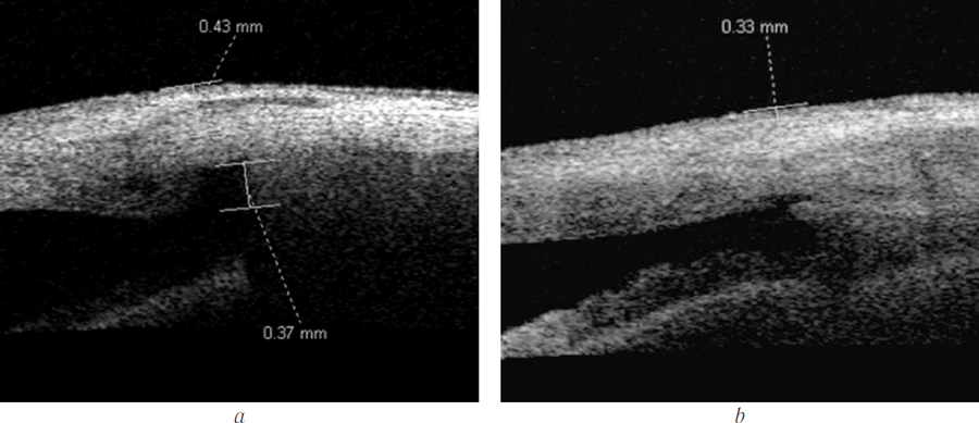 Рис. 3. Оптическая когерентная томография зоны антиглаукомной операции через 2 года после лазерной операции: а — пациент М., основная группа. Визуализируется низкой оптической плотности фильтрационная подушка высотой 0,43 мм. Интрасклеральная полость выражена, высота 0,37 мм, отмечается незначительное количество включений низкой оптической плотности, расположенных пристеночно; b — пациент К., контрольная группа. Визуализируется средней оптической плотности фильтрационная подушка высотой 0,33 мм. Интрасклеральная полость щелевидная, практически полностью заполнена включениями высокой оптической плотности