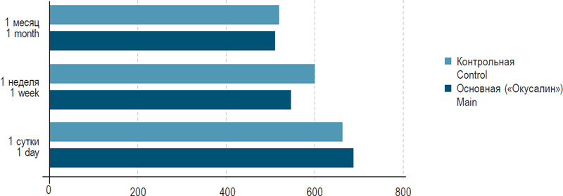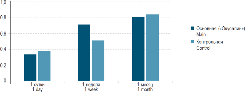 В первый день после операции в обеих группах было отмечено повышение остроты зрения по сравнению с дооперационными значениями, при этом различий между группами не наблюдалось. В динамике статистически значимое улучшение показателя остроты зрения было отмечено у пациентов основной группы («Окусалин») к 7-му дню после операции по сравнению с первым днём (p < 0,05). В последующем острота зрения повышалась, а данный показатель стабилизировался (табл. 1, рис. 1).