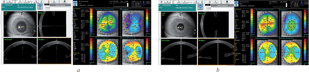 Комплексное офтальмологическое обследование, которое включало в себя стандартные и дополнительные методы исследования (эндотелиальная микроскопия, оптическая когерентная томография роговицы), проводили всем пациентам до и после операции (1 день, 1 неделя, 1 месяц). Факоэмульсификацию выполнял на приборе Infiniti (Alcon, США) один хирург через роговичный разрез 2,2 мм. Для ультразвукового наконечника использовали иглы 0,9 мм Miniflared со срезом иглы 45° и силиконовым микросливом, соответствующим хирургическому доступу. Во всех случаях были имплантированы гидрофильные интраокулярные линзы с помощью одного типа инжектора и картриджа. Во время операции защиту эндотелия осуществляли по методике soft-shell. Интраокулярные линзы имплантировали на ирригации (раствор BSS), без использования вискоэластиков [10]. Оценку пахиметрической карты, корнеотопографии и визуализации слоёв роговицы выполняли с помощью прибора Casia (SS-1000, Tomey).