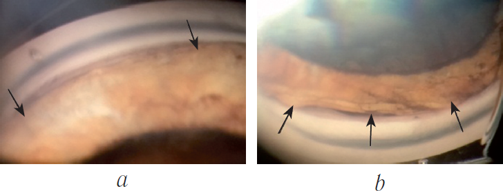 Рис. 6. Пациент Н., 60 лет: а — биомикроскопия. Отслойка цилиарного тела. Смещение кзади иридохрусталиковой диафрагмы; b — гониоскопическая картина. Отслойка цилиарного тела. Стрелкой обозначена склеральная шпора