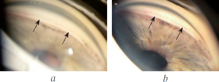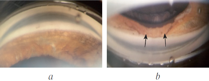 Рис. 3. Пациент К., 43 года. Гониоскопическая картина циклодиализа на 7 ч (а) и после склероувеоррафии (b)