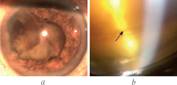 При осмотре ОЗ равнялась нулю. Передняя камера глубокая, частично заполнена сгустками крови. Иридохрусталиковая диафрагма смещена кзади, выраженный иридофакодонез (рис. 6, a).