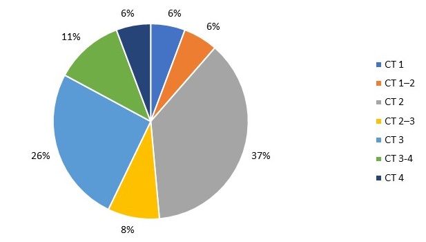 Fig. 1. The degree of severity of lung tissue damage of the studied patients (n = 35) on admission according to the results of X-ray computed tomography of lungs. Note: CT — the degree of lung damage according to the results of X-ray computed tomography.