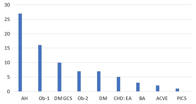 Fig. 2. The incidence (%) of comorbid pathology in the study patients (n = 35). Notes: АH ― arterial hypertension, Ob-1 ― 1 degree obesity, DM GCS ― diabetes mellitus associated with glucocorticosteroid intake, Оb-2 ― 2 degree obesity, DM ― diabetes mellitus, CHD ― coronary heart disease, EA ― exertion angina, BA ― bronchial asthma, ACVE ― acute cerebrovascular event, PICS ― postinfarction cardiosclerosis.