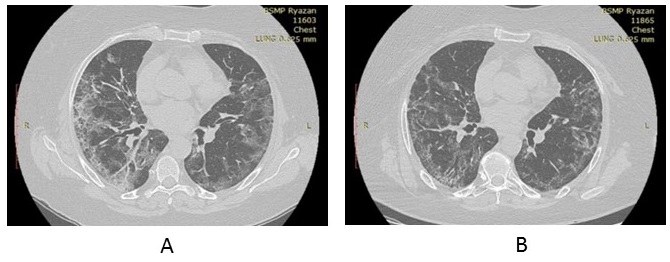 Fig. 3. Dynamics of changes of the results of X-ray computed tomography of lungs of patient R., 61 years old, with COVID-19, in the course of complex treatment including bovhyaluronidase azoximer: in the hospital on admission (18th day of illness, before start of therapy with bovhyaluronidase azoximer) (A), 27th day of illness (10th day of treatment with bovhyaluronidase azoximer) (B).