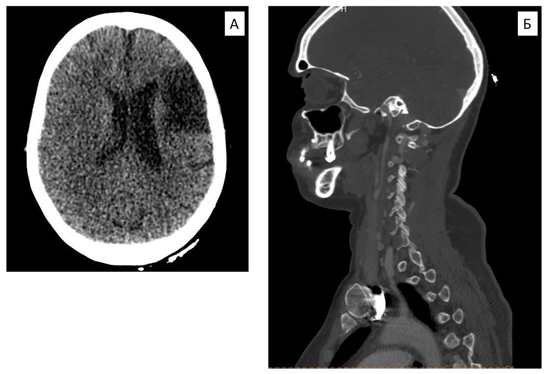 Рис. 1. Компьютерная томография брахиоцефальных артерий и головного мозга пациентки до оперативного вмешательства (2020): кистозно-глиозные изменения левой лобной доли (А); окклюзия общей сонной артерии (Б).