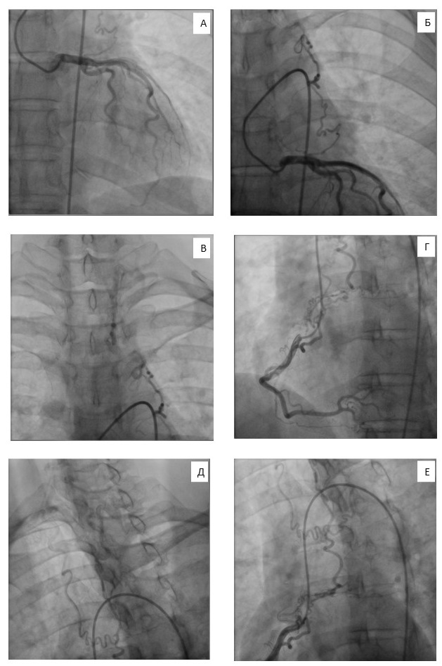 Рис. 2. Ангиограммы пациентки, демонстрирующие наличие коллатерального кровоснабжения между системой правой и левой коронарных артерий и левой позвоночной артерией: коллатерали между левой коронарной артерией и левой позвоночной артерии (А, Б, В); коллатерали между правой коронарной артерией и левой позвоночной артерии (Г, Д, Е).