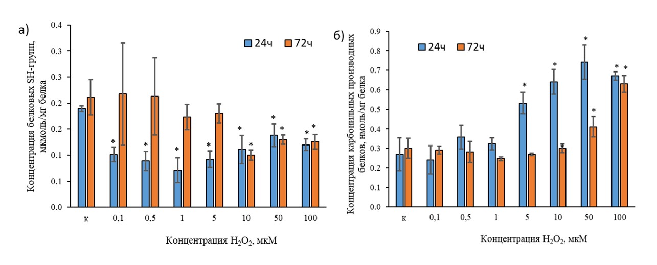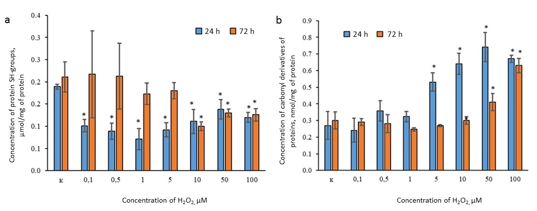 In incubation of Caco-2 line cells for 24 hours, the content of protein SH-groups in cells showed a statistically significant reduction on exposure to Н2О2 over the whole range of studied concentrations, relative to the control values.