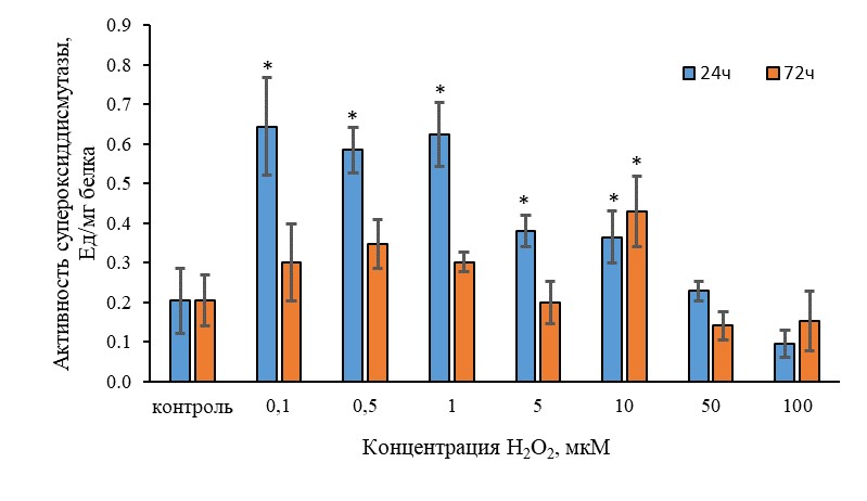 Fig. 2. Activity of superoxide dismutase in cells of Caco-2 line on exposure to hydrogen peroxide at concentrations of 0.1–100 µM within 24 and 72 hours. Note: * statistically significant differences from control, р < 0.05 (Newman-Keuls test).