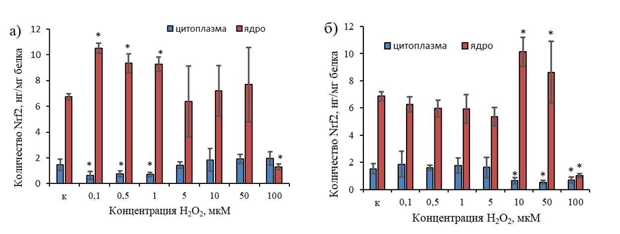 Preparation of cytoplasmic and nuclear fractions of cell lysates for analysis. The cells were inoculated in 6-well plates on the basis of 105 cells per each well, and cultured for 21 days, then cultural medium with H2O2 was added. After termination of exposure, cells were removed from the wells with trypsin-EDTA solution (0.25% trypsin and 0.2% EDTA, Sigma-Aldrich, Germany). The cells in the quantity of 1 × 106 were three times washed with pH 7.4 phosphate buffer (PanEko, Russian Federation) and separated to cytoplasmic and nuclear fractions using commercial Protein extraction kit (cytoplasmic/nuclear), BioRad, USА). The obtained lysates were used for quantitative determination of Nfr2 in the cytoplasm and nucleus.