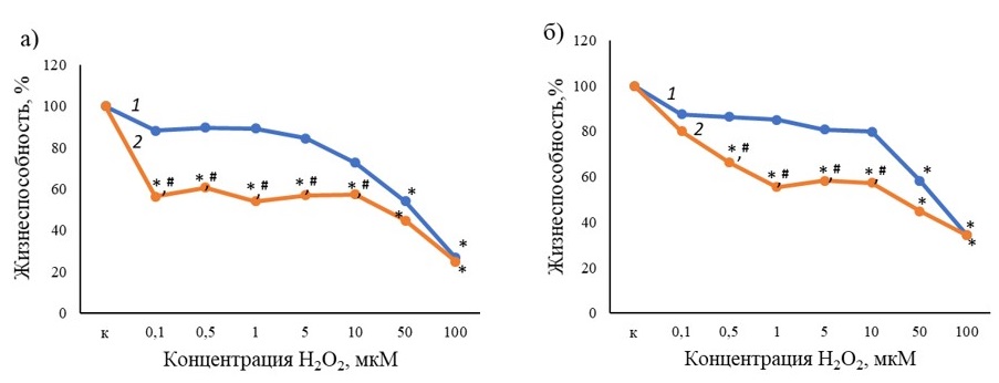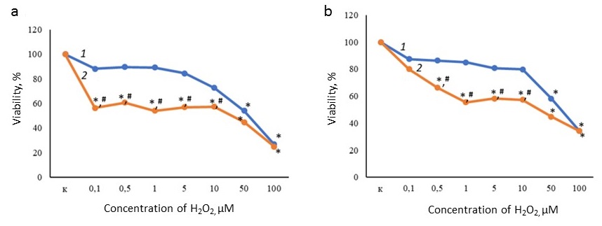 Cytotoxic test (MTT test). The cells were inoculated in a 96-well plate at the rate of 104 cells per well and cultured for 21 days, then the nutrient medium with H2O2 was added. After termination of incubation, 20 µl of 0.5% 3-(4,5-dimethylthiazole-2-yl)-2,5-diphenyl tetrazolium (MTT) bromide solution were added into each well and incubated for 2 hours, then the MTT solution was removed and 200 µl of 1% dimethyl sulfoxide solution were added (PanEco, Russian Federation) [11]. Absorption was measured after 10 min at 530 nm on Stat Fax 2100 spectrophotometer for plates (Awareness Technology, USA).