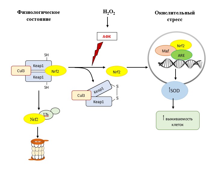 The described cascade of biochemical processes is of importance in maintenance of the viability of cells in OS conditions. On exposure of Caco-2 line cells to H2O2 at concentrations of 0.1–10 µM for 24 hours and of 0.5–10 µM for 72 hours, the cell viability was maintained due to transcription factor Nrf2, which is confirmed by a significant reduction of percent of cells that survived in conditions of Nrf2 inhibition by AEM1.