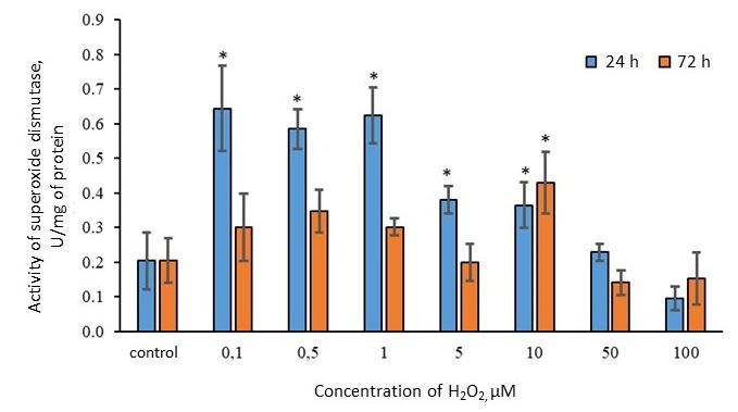 Fig. 2. Activity of superoxide dismutase in cells of Caco-2 line on exposure to hydrogen peroxide at concentrations of 0.1–100 µM within 24 and 72 hours. Note: * statistically significant differences from control, р < 0.05 (Newman-Keuls test).